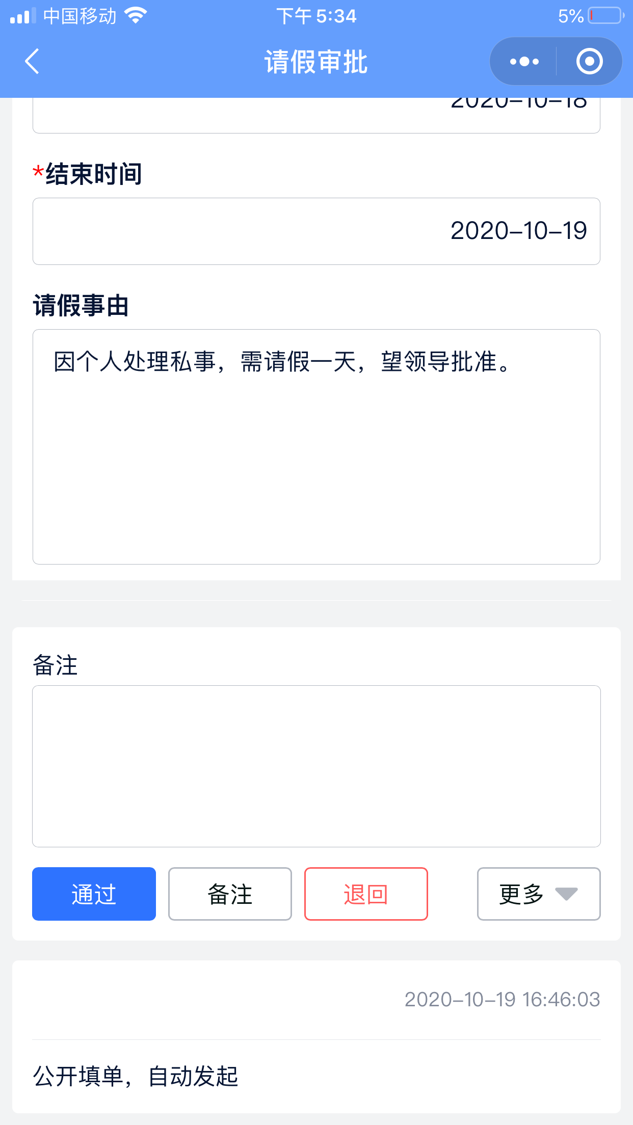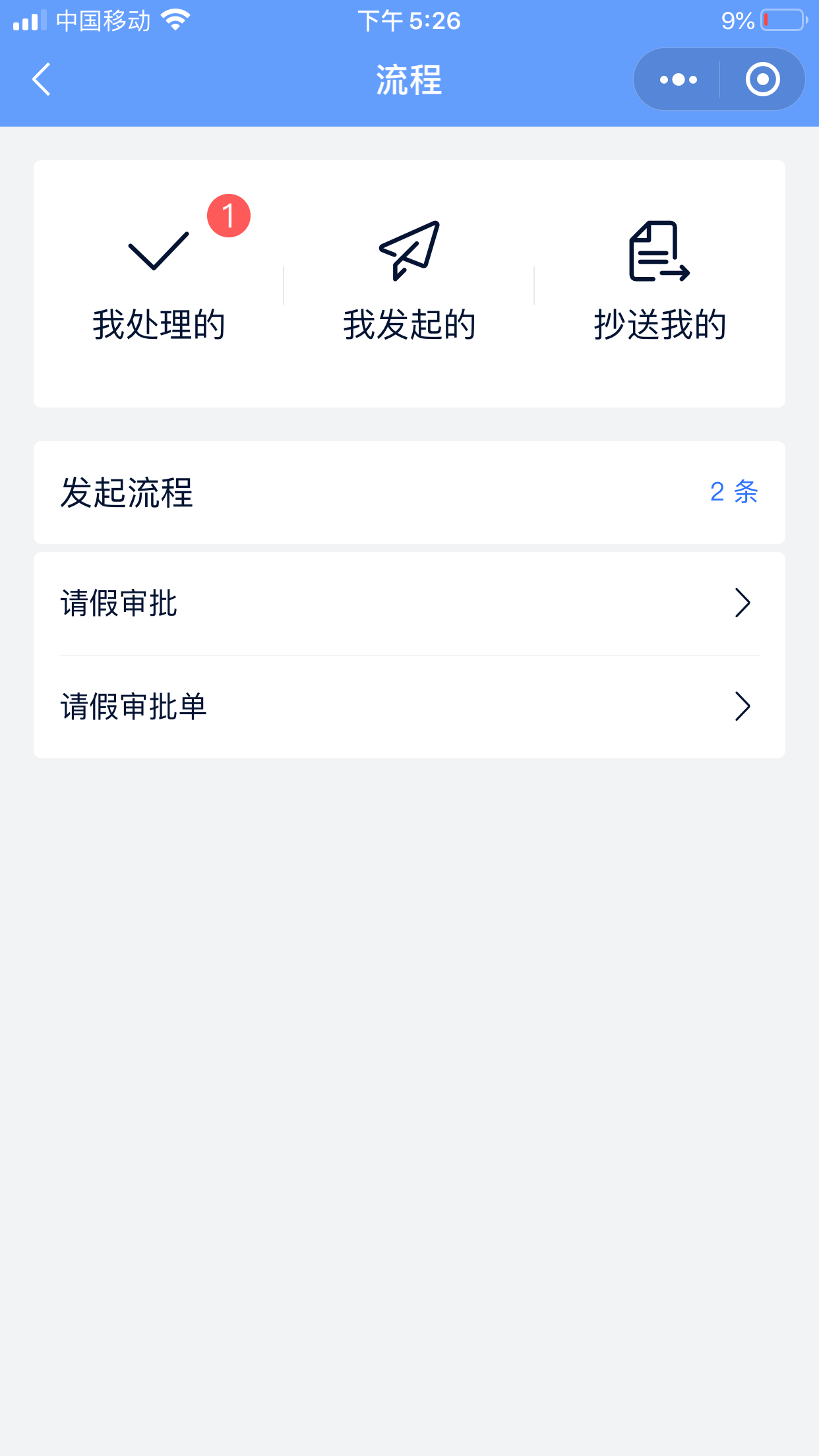 下面以大家最习以为常的请假审批场景为例,介绍如何使用手机进行流程审批:
