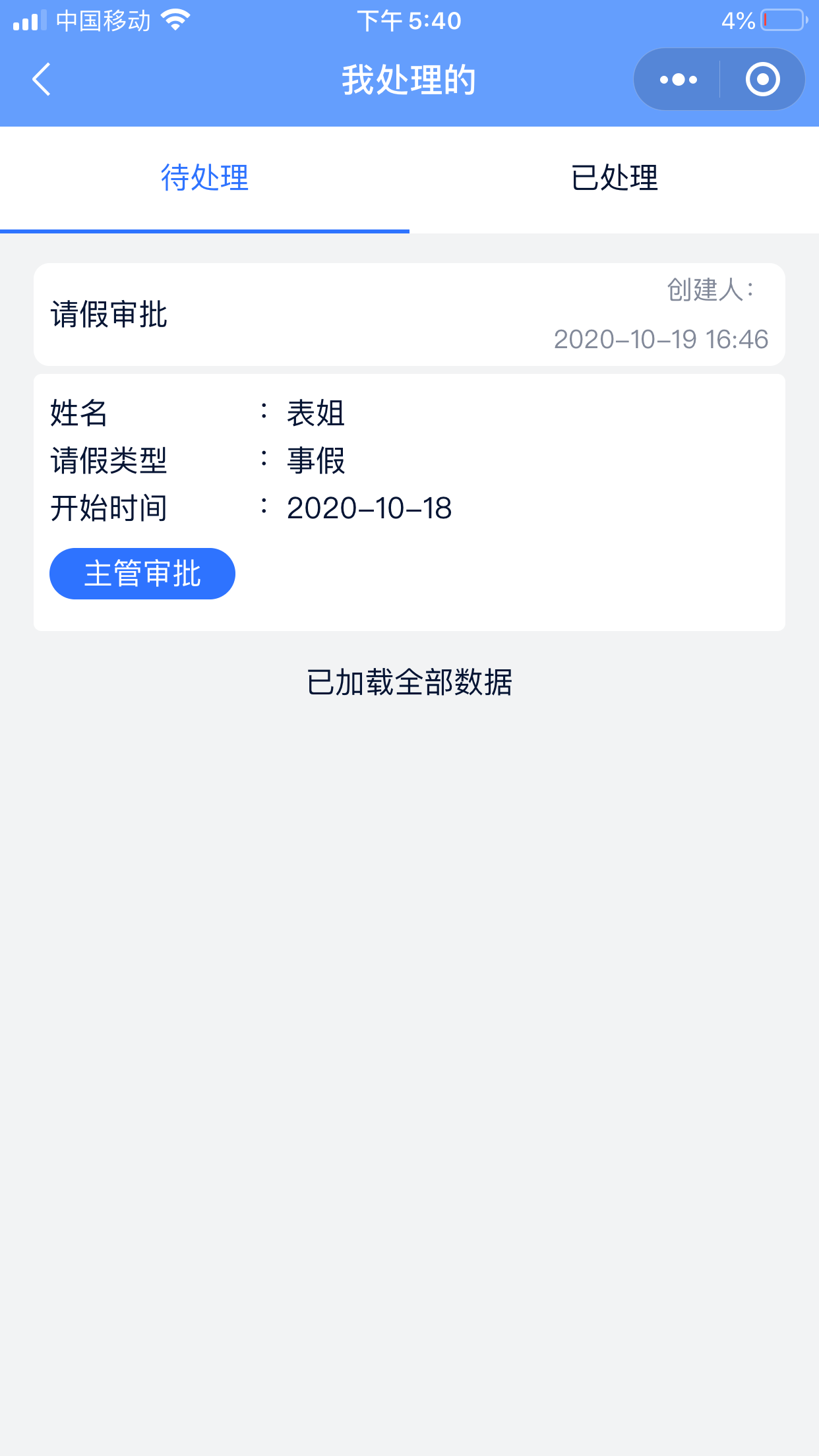 打开“我处理的”可以查看全部待处理的流程,点击表单就直接进入到审批页面, 审批通过后,系统就会根据搭建的流程自动流转至下一节点负责人处理请假审批。